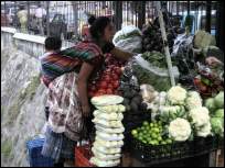 Am La Terminal kommen wir an, es ist nicht nur der Haupt-Busbahnhof des Landes, auch der groesste Warenumschlagplatz und Markt und alles andere als einladend auf kleinster Flaeche. Unzaehlige russende, hupende Busse verstopfen die engen Strassen und bringen Handelsgueter aller Art – und Menschen, die sie kaufen. Dicht gedraengt stehen die kleinen Laeden, Staende oder meist Holzverschlaege, viele davon illegal. Obst, Gemuese, Fleisch und Meeresfruechte werden angeboten, genauso wie Ersatzteile, Motoren oder Kleidung, Eiswagen oder Tortillastaende - es gibt nichts, was es hier nicht gibt.