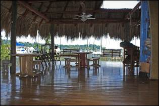 Die Monkeybay-Marina im Dschungel am Rio Dulce ist der ungewoehnlichste Lagerplatz auf unserer bisherigen Reise. Wie eine Marina wirkt die Anlage gar nicht, wenn da nicht die Stege fuer ein paar Boote waeren. Wo hoert man auch sonst so nah die Affen in den Baeumen bruellen neben all dem Vogelgezwitscher? Es gibt ein paar der landestypischen palmstrohgedeckte Huetten fuer Duschen, offene Werkstatt, offene Aussenkueche zur allgemeinen Nutzung mit Gasplatten, Grill und Tiefkuehlschrank und das Schmuckstueck: eine riesige offene Veranda zum Faulenzen mit gemuetlichen Sofas, Haengematten, Tischen und Stuehlen, von Ventilatoren zusaetzlich gut belueftet.