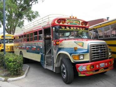 Die wenig bequemen und ziemlich schmutzigen Chicken-Busse steuern meist die Nebenstrecken an. Die Huehnerbusse sind amerikanische Schulbusse, die dort seit Jahren ausrangiert sind und hier in Guatemala noch mehrere hunderttausend Kilometer Dienst auf kurvigen Hochlandpisten absolvieren, bevor sie gaenzlich auseinanderfallen. Sie transportieren in einer Tour Unmengen an Menschen, Tieren und Waren in die entlegendsten Winkel des Landes.