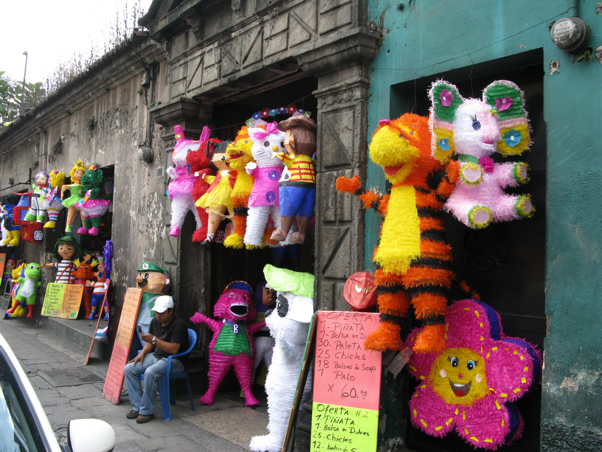 Das Geheimnis ist gelueftet, es sind Pinatas. Sie werden gekauft fuer Gebutstage oder andere Festlichkeiten, gefuellt mit Bonbons und waehrend sie hoch oben irgendwo aufgehaengt sind, fallen beizeiten die Leckereien aus den Fuessen heraus. Ein Mordsgaudi fuer den Beschenkten und die Gaeste.