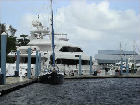 Es ist Sonntagabend, so legen wir uns an den Anfang des Stegs in die Marina in Fort Lauderdale und warten ab, was der naechste Tag und die endgueltige Diagnose in der Werft uns bringen wuerde. Wie ihr Euch denken koennt, ist Senta im Vergleich zu den meisten Booten dort winzig. Wohin man blickt, nur riesige Motoryachten, besetzt mit Crews, die zum Auftanken oder fuer Reparaturen dort weilten und den eigentlichen Eigner nur ab und an aufnehmen fuer eine Vergnuegungstour. Und weil sie so riesig sind, klappt es auch nicht mit dem Internet bei uns, sie schotten uns richtig ab vom Netz.